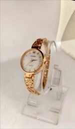 Elevate your everyday style with this elegant women’s wristwatch. Featuring a sophisticated black dial that contrasts beautifully with the gleaming gold-tone hands and markers, this timepiece offers a luxurious look. The highlight of the design is the intricate floral cutout pattern on the gold-tone bangle strap, adding a delicate and feminine touch. Powered by a reliable quartz movement, this watch blends fashion with functionality, making it a perfect accessory for both casual outings and festive occasions.