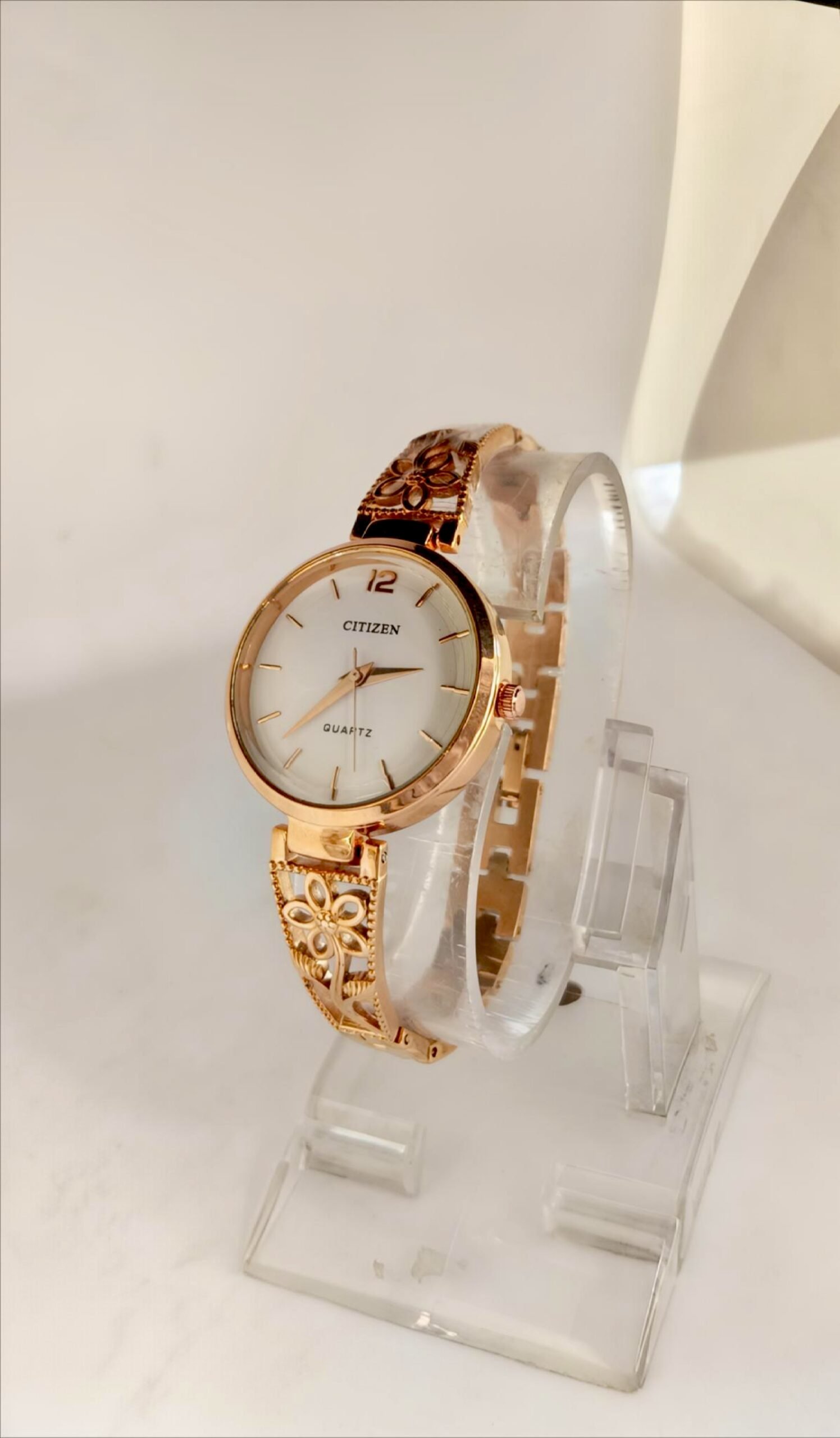 Citizen Quartz Women’s Gold-Tone Bangle Watch with Floral Cutout Design & Black Dial & White dial