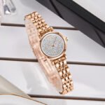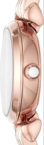 The highlight of this watch is its breathtaking pavé dial, completely adorned with sparkling crystals that catch the light from every angle. It features sleek rose gold hands and the iconic Emporio Armani eagle logo at the 12 o’clock mark, keeping the look clean yet sophisticated. The polished link bracelet ensures a comfortable fit, making it an ideal choice for both special occasions and daily wear.