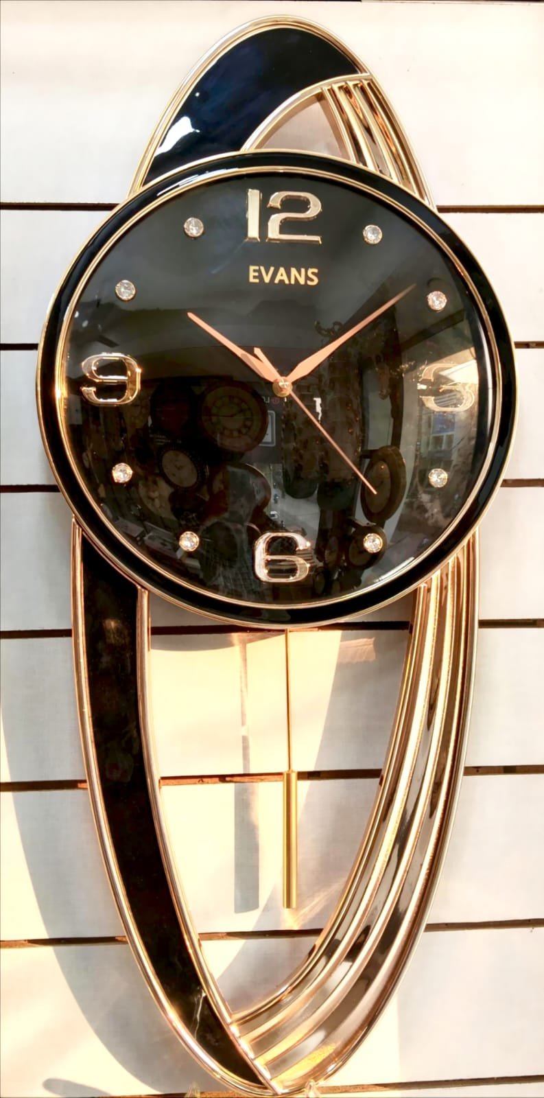 Price: ₹3,825 * Brand: Evans (as seen on the dial). * Design: Modern, vertical, and abstract loop frame. * Dial: Clean white with crystal hour markers. * Frame: Layered white and gold curved metalwork. * Color: Gold and White. * Material: High-quality metal and enamel/acrylic.