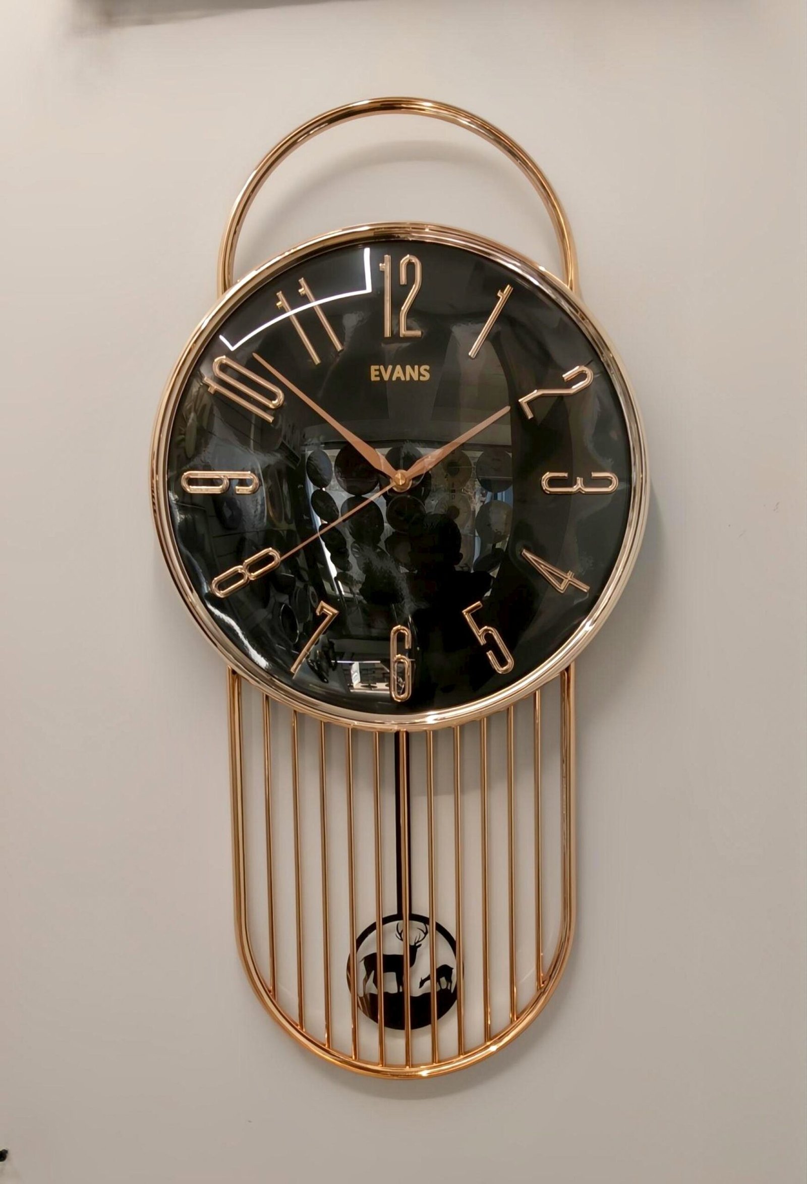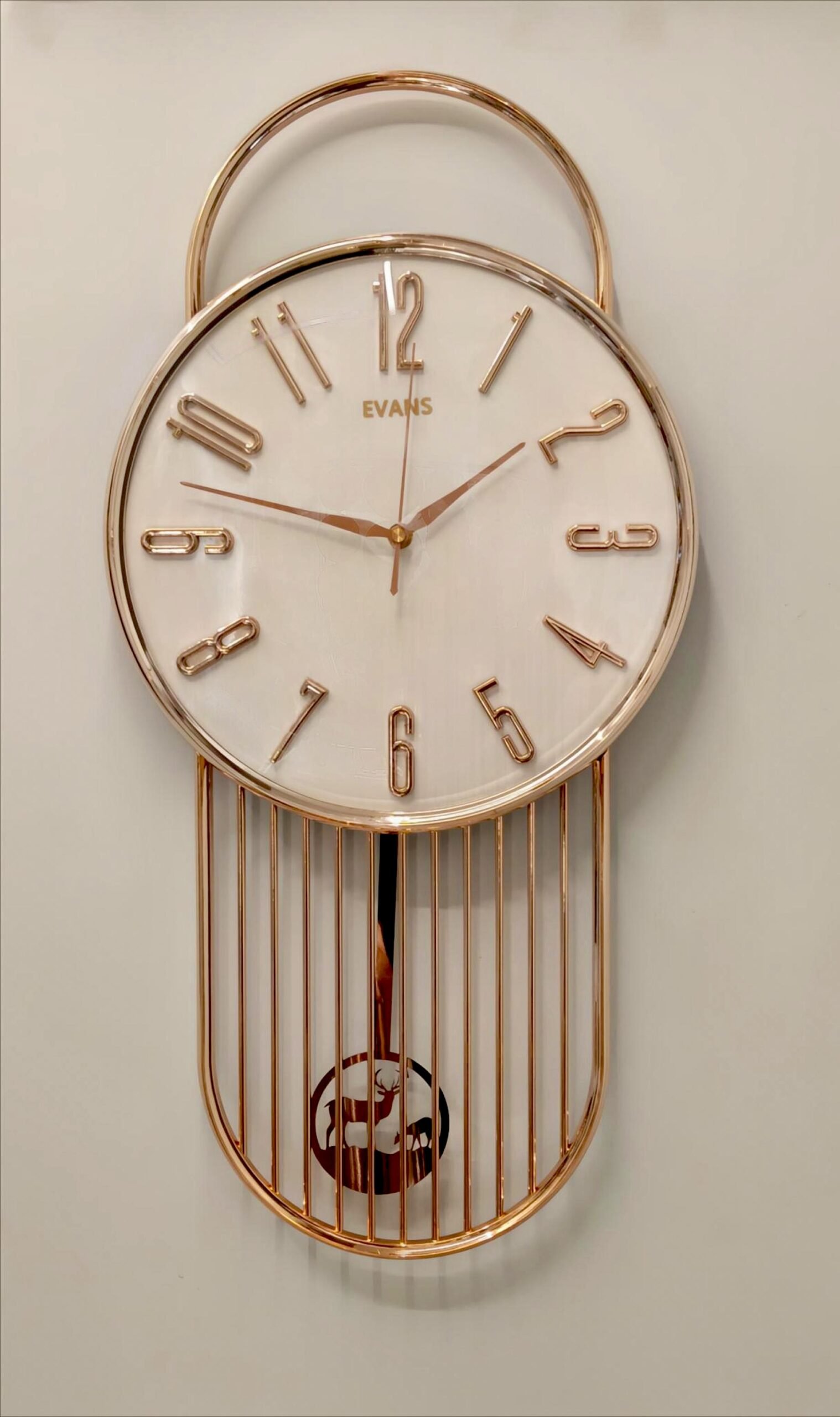 Evans Luxury Rose Gold Wall Clock with Deer Motif Pendulum” Evans Modern Decorative Metal Wall Clock with Pendulum)