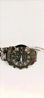 ​The watch showcases a chronograph-inspired design with three decorative sub-dials, adding a sporty and sophisticated touch. Encased in a durable black metal finish with a matching stainless steel strap, it offers a sleek, monochrome look suitable for both formal occasions and casual daily wear. This timepiece is the perfect accessory for those who appreciate a blend of luxury aesthetics and rugged durability.”