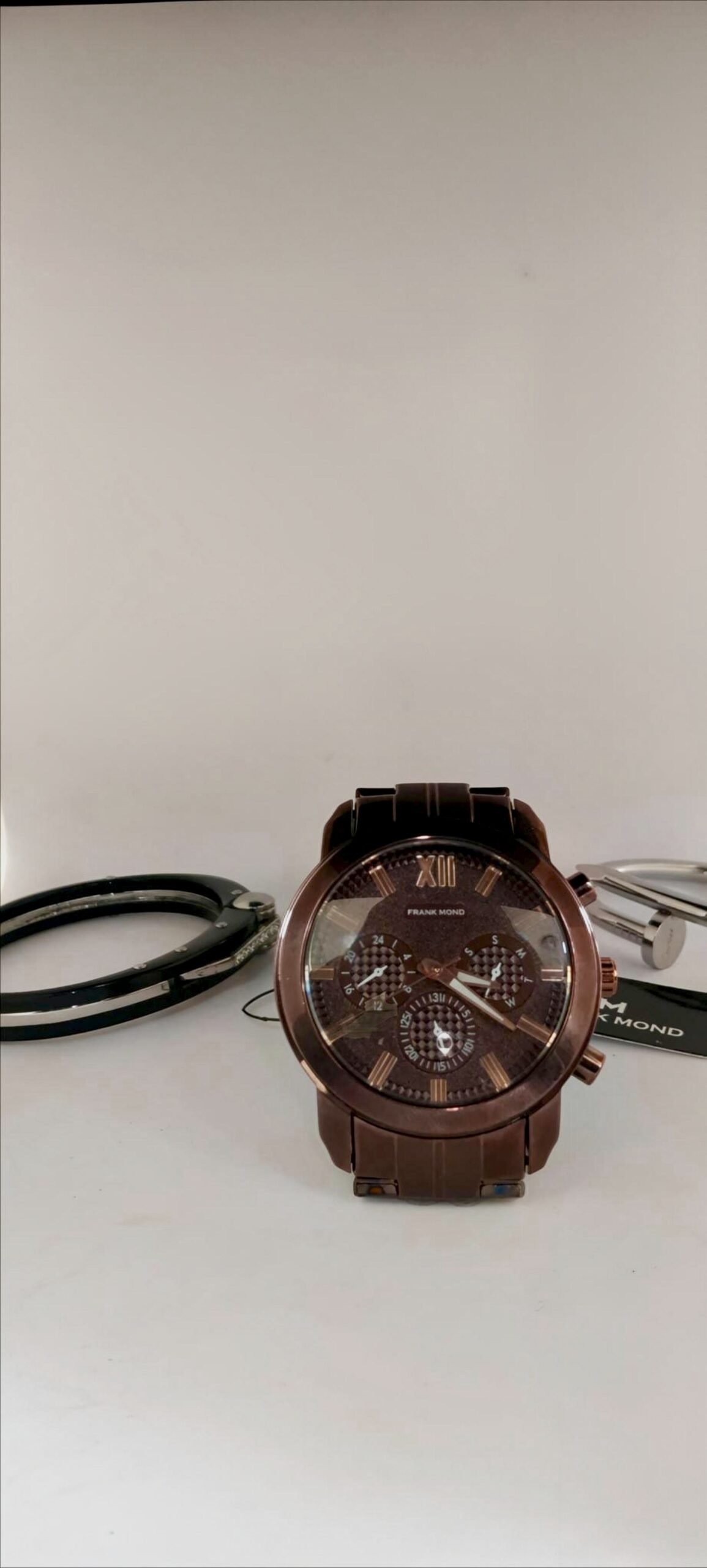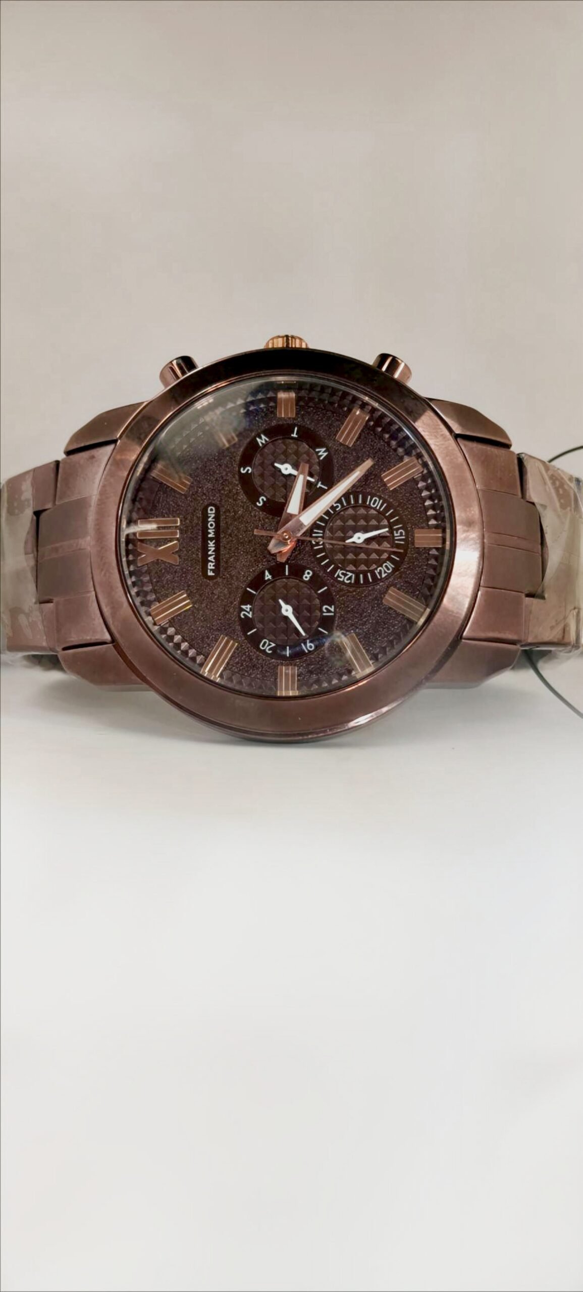 Elevate your style with this striking Frank Mond timepiece. Featuring a unique coffee-brown plated finish, this watch combines rugged elegance with modern functionality. The textured dial is accented with bold Roman numerals and houses three functional sub-dials that display the day, date, and 24-hour time. Paired with a matching stainless steel link bracelet, this watch offers a premium chronograph look perfect for casual outings and special occasions.”