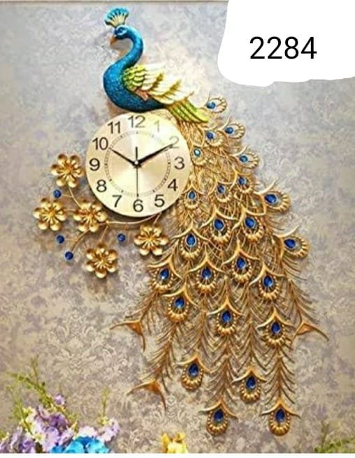Symbolic Beauty Meets Modern Timekeeping. The Model 2284 captures the majestic grace of a peacock in a stunning, vertically oriented design. The piece features the peacock figure, rendered in vibrant turquoise and green, perched above a classic silver/golden-tone dial. Its long, elaborate tail feathers trail below, crafted from gold-finished metal and dotted with deep sapphire blue jewel accents. Complementing the design are delicate floral clusters, adding a soft, luxurious touch. This clock is perfect for narrow wall spaces, adding height and artistic flair to your living room, entryway, or dining area.