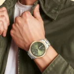 Elevate your style with a touch of glamour and a hint of nature’s beauty. This stylish watch boasts a mesmerizing green shining dial adorned with gold indices, perfectly complemented by a coordinating gold bezel. The bi-metal silver and gold bracelet not only ensures a secure fit but also adds a luxurious touch. Immerse yourself in the enchanting world of fashion by pairing this timepiece with your favorite green outfits, creating a look that effortlessly captures attention and admiration.